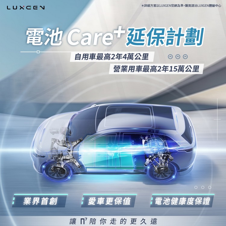 3、 《電池Care+》延保計劃:歡慶n⁷啟動交車滿周年,為感謝車主一路支持,LUXGEN推出業界首創電動車電池延保尊榮方案,提供自用車最高10年20萬公里,營業用車最高8年75萬公里的電池保固服務(適用車型:n⁷ 5人純粹版 & n⁷ 5人亮點版 & n⁷ 七人亮點版)。此方案不僅展現LUXGEN對電池品質的高度信心,更讓車主在長期用車過程中免於擔憂電池健康下降,保障未來維修成本、提升車輛保值性,讓n⁷陪你走得更遠,建議售價18,800元起,為愛車加上一道無形的安心防線;營業車主即日起到6/30為止,亦有機會透過格上租車入主n⁷指定車型享特殊優惠電池延長保固1年/10萬公里。想了解更多關於《電池Care+》延保計劃的細節請參閱LUXGEN官網或洽詢LUXGEN全台體驗中心。