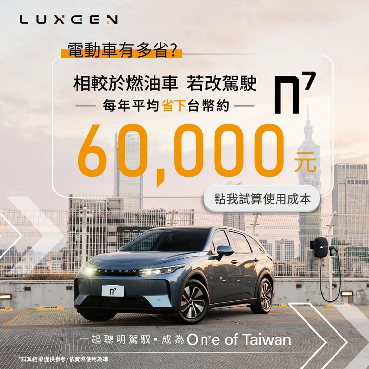 讓你長久用車不怕電池健康度下降,使用更安心、維修成本更可控,愛車更保值,以及全民響應「分享即享回饋與抽獎」(4),讓不是n⁷車主的你也可以透過「E智算」了解換購n⁷可以省多少錢!只要將試算成果一鍵分享,即可獲得限量100台「n⁷ 1:43合金模型車」的抽獎機會,n⁷車主完成分享更可額外獲得「10點亮點」,LUXGEN邀你一起純電+1,寫下更多屬於On⁷e of Taiwan的純電篇章。