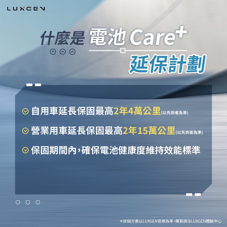3. 《電池Care⁺》延保計劃為原廠電池提供額外選購延長保固服務,車主首次領牌一年內依牌照類別(自用/營業)購買一年期或兩年期電池延長保固。適用車型之條件與方案詳細內容請參考LuxShop產品介紹,如有相關問題或欲進行購買,請洽LUXGEN體驗中心,將由專人為您解答。