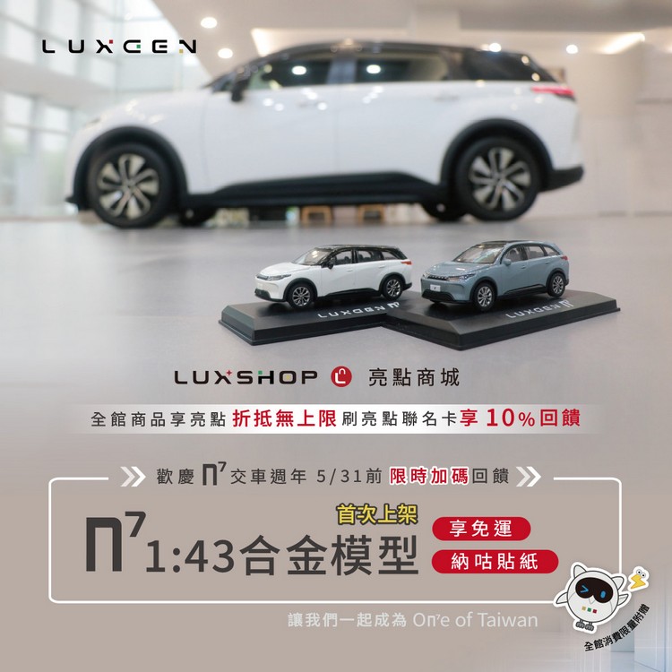 2、 LuxShop限時活動:廣受好評的「n⁷ 1:43合金模型車」限時限量開賣,活動期間透過LuxShop購買「n⁷ 1:43合金模型車」,即享免運返點活動,還可獲得「納咕貼紙」,讓你輕鬆把n⁷帶回家。