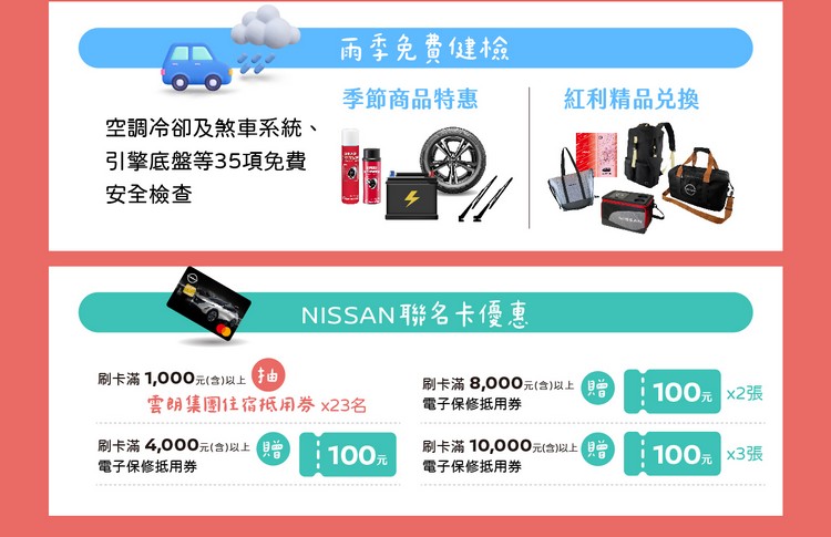 本活動期間內,NISSAN同步推出多項原廠零配件與保養優惠方案,包含ThreeBOND前擋玻璃耐久鍍膜8折起、空調冷卻系統保養及防疫抗菌套餐優惠、輪胎電瓶等多項零配件特惠價格,更提供紅利點數換購輪胎折抵專案,最高可折抵1,200元。此外,玉山銀行NISSAN聯名卡同步推出單筆刷卡滿額贈「電子保修抵用券」活動,凡至NISSAN服務廠消費,單筆刷卡滿4,000元即贈100元電子保修抵用券乙張、單筆刷卡滿8,000元加贈乙張,單筆刷卡滿10,000元再加贈乙張,最高可獲得總計300元電子保修抵用券;單筆刷卡消費滿1,000元再抽「雲朗集團住宿抵用券」,共計23個名額。