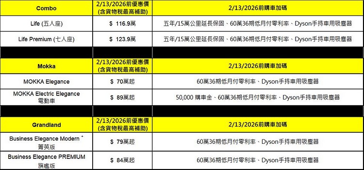 「Mokka、Grandland」優惠: 即日起至2/13/2026止,凡入主Grandland & Mokka,皆可享有60萬36期低月付零利率並加贈價值9,900的Dyson手持車用吸塵器。