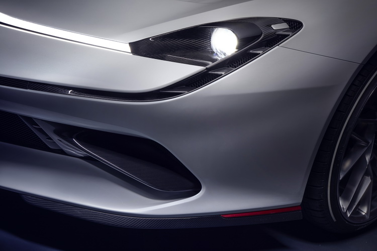 相較於日內瓦車展的首發版本,更新版在反映空氣動力模擬實驗之下對車頭做了設計修改,為前保桿與進氣口換新造型,這也讓整個車子從車頭至車尾的視覺連續性更為明顯。車身為單體式全碳纖維材質構造,鈑件也是碳纖維製,而在車體前後則以鋁合金材質來做為撞擊意外發生時吸收撞擊能量的緩衝材。