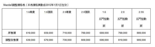 因應日圓匯率不斷高昇,相關生產零組件成本居高不下,繼其他日系品牌相繼調漲售價之後,MAZDA台灣總代理宣布將自2012年1月1日起,調漲旗下主力車款Mazda3的售價。