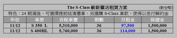 ![]() Mercedes-Benz S-Class一直以來都是大型高級豪華房車的典範,每一代新型車款,無可比擬的外觀建立了未來設計與多樣化豪華配備的標竿,台灣賓士針對 11/12 年式 S 350 BlueEFFICIENCY L 和S 400 HYBRID L 兩款車型,推出「嶄新靈活租賃方案」,提供車主彈性靈活的租賃模式,合約共計三年(36期),客戶可於兩年期滿(24期) 註1時提前結清還車,並選購其他 Mercedes-Benz S-Class 車款,不須另外支付解約金註2,月付$97,500起,即可輕鬆入主賓士豪華旗艦車款 S-Class。