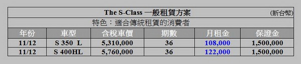 S-Class 零利率貸款及一般租賃方案購買 11/12 年式 S 350 BlueEFFICIENCY L 和 S 400 HYBRID L 除了創新的「嶄新靈活租賃專案」,還有更多元選擇!「一般租賃方案」,適合偏好傳統租賃方案之消費者;以及「零利率優惠貸款專案」360 萬 60 期購車優惠,多重購車方案提供消費者最合適的選擇。此外,即日起至2月29日(含)前購買並完成交車及掛牌之 11/12 年式 S-Class 車主,台灣賓士均免費提供 3 次原廠衛星導航軟體升級服務。