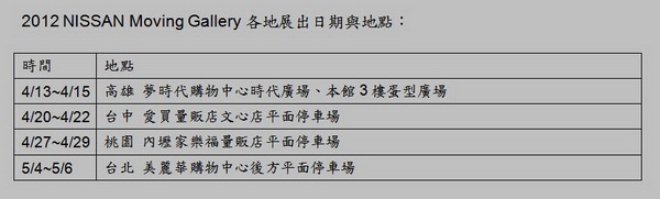 裕隆日產汽車戮力於實現Zero Emission零排放計畫,舉辦2012 NISSAN Moving Gallery巡展,以「推動低碳生活、落實低碳教育」為主軸,活動會場建構NISSAN Green City(未來電動車城市),特別開放試乘全球首款量產的純電動車NISSAN LEAF,讓民眾得以親身體驗NISSAN先進零排放科技,活動將於4月13日(五)在高雄夢時代購物中心正式起跑。