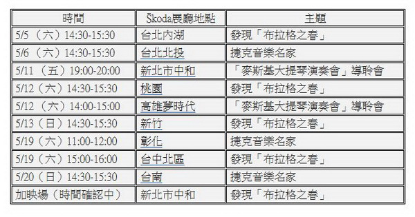 布拉格之春音樂節是全球最著名的音樂節之一,每年五月十二日在布拉格為整個歐洲的音樂活動拉開序幕。為了讓台灣喜好古典音樂的樂迷們可以感染布拉格之春的音樂氛圍,Škoda總代理特別與愛樂電台合作「音樂布拉格」系列活動,並獨家贊助「麥斯基大提琴獨奏會」。為了讓更多樂迷們了解布拉格獨有的藝術風采,Škoda將於全省展示中心舉辦十場音樂賞析會,活動期間不論是賞車試駕或參與賞析會都有機會獲得「音樂布拉格」專屬CD或抽中「麥斯基大提琴獨奏會」貴賓券,歡迎有興趣之民眾踴躍參加。