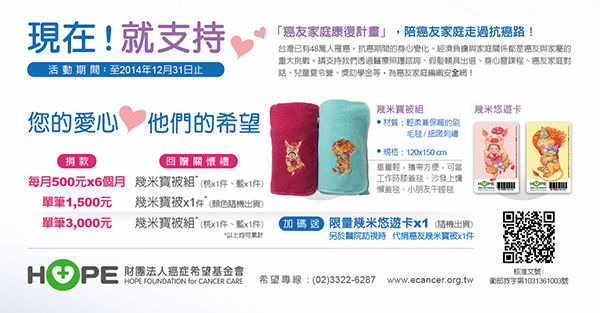 《癌症希望基金會》為「陪伴」關懷禮,分享愛、關懷癌友家庭,散播希望的種子,同時為癌友家庭編織照護安全網,特別邀請愛心企業、媒體、通路、銀行信用卡公司等共襄盛舉,提供幾米圖案的刷毛毯作為愛心人士捐款滿額禮,並將巡迴北中南給正在治療的癌友,給他們加油打氣。