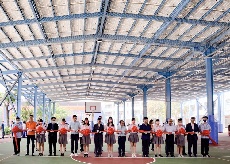 ![]() 「陽光球場」由裕電能源與「迅捷光電」合作,將原本的露天球場進行改造,有別於風雨球場搭建模式,以太陽能板取代鋼浪板鋪設超過1,600片,佔地面積達3,300平方公尺,光電板架高達9公尺,充分運用太陽能板透光性較高,不需要額外輔助燈光照明,「陽光球場」擁有專利認證的屋頂構造設計工法,利用鋼構下鎖式設計工法安置太陽能模組,讓每片模組達到緊密貼合效果,且以不銹鋼螺絲鎖附與塗抹防鬆脫膠,提供校方安全實用且環保的「陽光球場」,有效降低露天球場溫度,解決光線不足時照明耗電問題,不僅達到綠色永續校園目標,更提供屏東縣學子更佳運動學習環境。