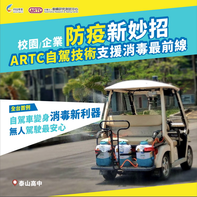 ![]() ▲車輛中心自駕技術研發多年有成,可協助企業、學校等單位打造自駕載具,應用於防疫消毒或封閉場域人員接駁、物品載送等。泰山高中為推動學校發展特色,建置AI相關技術,特與車輛中心合作,將高爾夫球車改裝成無人自駕消毒車,在停課不停學的校園中,自駕消毒車可定時固定路徑進行消毒工作,減輕工作人員負擔與接觸風險,提高工作效率。