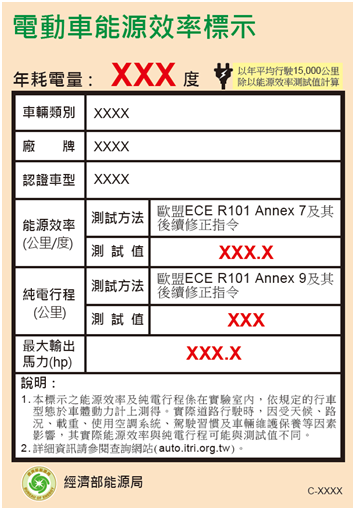 ![]() 電動車使用電池與馬達為動力來源,當電池電量耗盡時需對電池進行充電,一般以每度電可行駛里程數(公里/度)來辨別電動車的能源消耗優劣。國內所採行的電動車輛能源效率標示,是依據歐盟ECE R101及其後續修正指令之方法進行測試,其流程主要可分為車輛電池充電、行車型態行駛/行駛里程紀錄、充電量紀錄(Wh)、能源效率計算(公里/度)等4步驟。其中行車型態可採用NEDC或WLTC其中一類,上述行車型態也應用於一般汽/柴油引擎車輛污染及油耗測試。