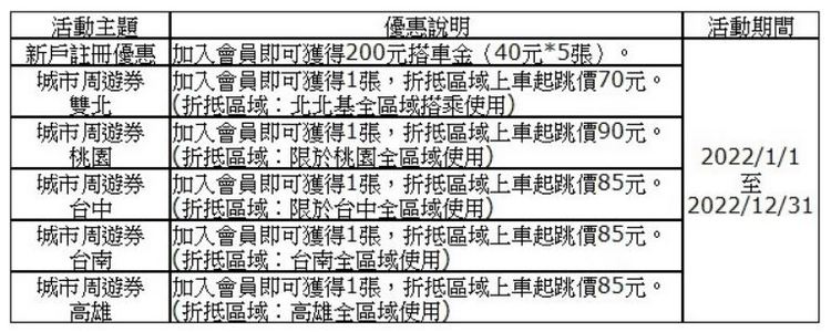 1.新戶註冊優惠券40元5張,共計200元。 2.城市周遊券5張,分別為雙北70元免起跳價優惠券1張、桃園90元免起跳價優惠券1張、高雄85元免起跳價優惠券1張、台中85元免起跳價優惠券1張、台南85元免起跳價優惠券1張。 B. 新戶註冊優惠券及城市周遊券須於領取後90天內使用完畢,逾期失效。 C. 優惠券須使用 app 派遣叫車搭配信用卡支付方可使用,每次搭車限使用一張,且不得與其他優惠併用。 D. 城市周遊券限於yoxi雙北、桃園、台中、台南及高雄營運範圍內上車方可使用,活動詳情請參考官網公告(https://www.yoxi.app/promotion/137)。
