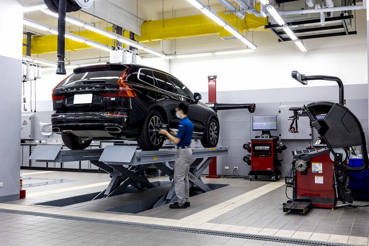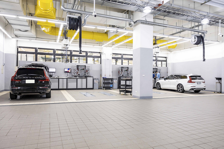 一樓後側為售後服務區,舒適的冷氣空調廠房設有 6 座快速保養工位、2座電動車維修工位與1座四輪定位工作區,特別選用不傷輪圈的美國 Hunter 新世代 3D 四輪定位機、全自動校準輪胎診斷平衡機與全自動拆胎機,同時符合 VOLVO 原廠規範的 SONIC MSS 系統工具組、整合油電水五合一專用作業捲盤、廢氣抽除系統、絕緣電動車維修平台等一應俱全,帶給車主安全有效率的保修服務。