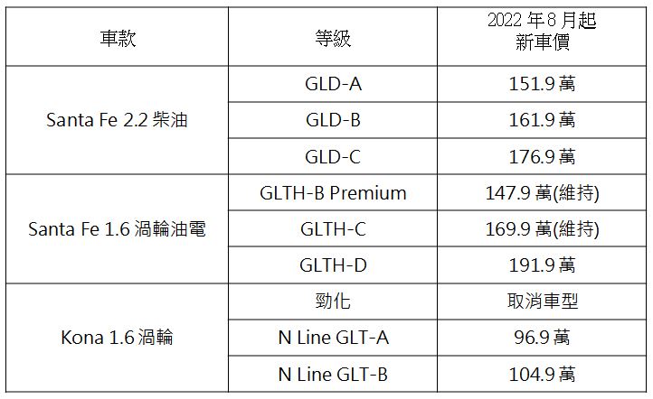 HYUNDAI總經銷南陽實業公布Kona N Line編成調整,全新導入維持198ps強悍馬力、百萬以下售價N Line GLT-A入門款,原N Line款則定為GLT-B高階款,以提供更多性能控車迷選擇。此外因應國際間製造生產成本、運輸成本高漲壓力,同日起進口七人座豪華SUV – Santa Fe調漲售價,GLD柴油各款及GLTH-D油電頂規款均調漲4萬元。