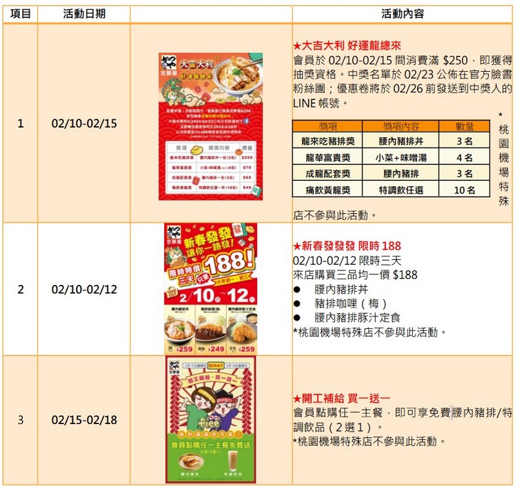 新年不用急著到廟裡,來份豬排也能給你好運氣!象徵能帶來勝利的豬排,同時也能為帶來好運!喜迎新春,〈吉豚屋〉在02/10-02/15祭出「大吉大利,好運龍總來!」抽獎活動,會員於期間內到店消費即享有抽獎資格,共有20個好禮名額等你來認領,還有機會免費吃腰內豬排!另外為大家討個好彩頭,特別在大年初一到初先三期間推出「新春發發發」活動。人氣三品(腰內豬排丼 / 豬排咖哩(梅) / 腰內豬排豚汁定食)均一價只要188,吃完包你發一整年!