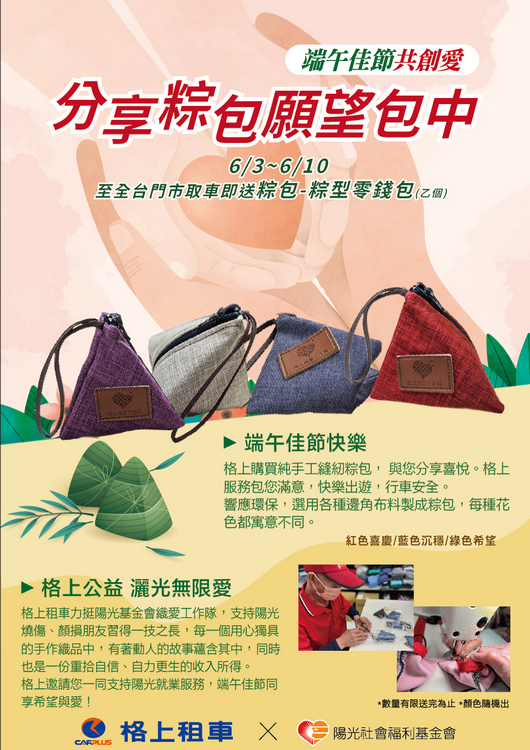 格上延續40週年公益行動,除力挺陽光加油站維護身障朋友的工作平權的多元共融倡議,也以實際行動公益採購織愛工作隊的傷友義賣小粽包商品,回饋給客戶一同分享愛的循環。即日起至6月10日端午節,只要至格上租車門市取還車,成功從格上官方LINE好友綁定格上Go Smart APP會員,即可獲得匠心獨具的小粽零錢包,限量3000個贈完為止。