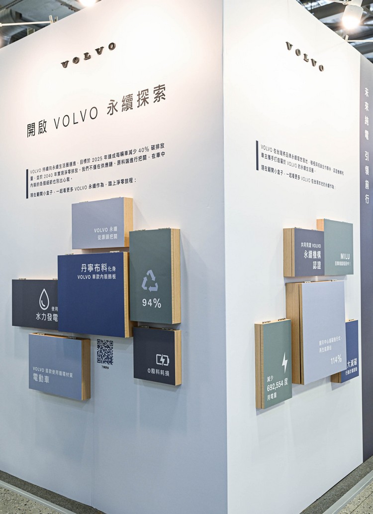 在未來商務展現場,VOLVO 現場展出 C40 Recharge、XC40 Recharge 兩款純電動車,讓來自四面八方對於科技趨勢、AI 應用感興趣的商務觀展者一同共襄盛舉,親身體驗 VOLVO 以領先科技引領汽車產業新格局。 「開啟 VOLVO 永續探索」展現 VOLVO 全球從製造到營運的高標準永續準則 作為全球首家宣布全面純電動化轉型的豪華汽車品牌,VOLVO 致力於守護環境永續發展,目標於 2040 年實現碳中和。VOLVO 本次進駐 2024 AI Taiwan 未來商務展的「永續與淨零減碳展區」,以傳達 VOLVO 在全球與在地貫徹品牌的永續發展理念。 在車輛製造上,VOLVO 是全球首間於車輛製程中使用零石化煉鋼的汽車品牌,在電池方面更以電池回收 0 廢料為目標,與全球最大鋰電池回收工廠 UMICORE 合作,採用獨家熔爐與高溫冶煉技術,將電池所分解出的元件再利用,達成零廢料耗損。VOLVO 在 2023年最新發布的電動休旅 EX30,車身的鋁料有四分之一為再生鋁材,再生鋼材達17%,車體所使用的塑膠也有 17% 來自再生材料,車室內部更運用創新牛仔布、亞麻、羊毛混紡等創新材質,打造品牌迄今為止碳足跡最低車款。