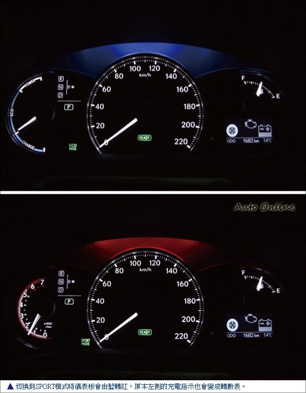 其他一些細節的地方CT 200h也都用上皮革包覆,加上縫線的處理提昇質感。其中比較有趣的是它的儀表板與它的中控台操作模式。CT 200h由於是油電復合動力,因此一般時後的儀表板上你看不到轉速表,僅會顯示電力回充的狀態。但一切入運動模式後話面會由藍轉紅,此時可以招喚隱藏起來的轉速表,頗有進入戰鬥狀態的感覺!