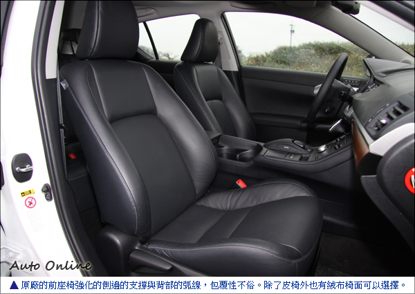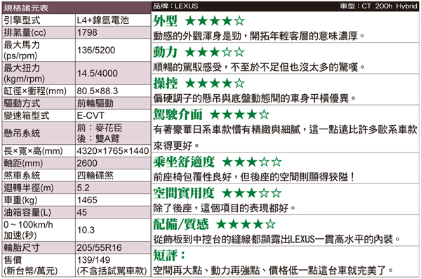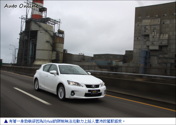 整車的運動外型讓人覺得這車應該要很犀利的樣子,雖然與實際上有點落差,不過CT 200h也有它的強項,那就是它的底盤呈現出相當扎實的路感。CT 200h的懸吊配置是麥花臣後雙A的設定,當初在阻尼的設定上就比較硬朗些。值得一提的過去LEXUS在F等級的車款才會找來的合作夥伴YAMAHA如今也為CT 200h在車身前後各裝上一支液氣複合的避震器來吸收碎震。加上LEXUS本來就純熟的Hybrid與隔音技術,太安靜的狀態下有時候還真讓駕駛搞不清楚車輛是否正在發動中。雖然目前傳出LEXUS掀背車型只會有Hybrid版,不過以這車的底盤設定若有汽油引擎版的話我想整體的戰鬥力會大幅增加不少。 整體而言CT 200h的身子骨在原廠特意的強化之下著實顯得硬朗,連續小角灣車體抗扭曲性也讓人有歐系車的感覺。加上良好的隔音與細微振動的抑制,CT 200h讓人開的舒服順暢,但要說所謂的激情或是豐沛則是不會發生的事。