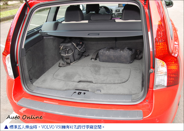 VOLVO V50的後座椅採6/4分離先前翻坐墊再翻倒椅背的設計,可保持行李廂空間最大的平整度,並可變化出417L/1307L的行李廂空間。附有行李廂的雜物固定隔板,讓易滑動的雜物有簡單的固定方式,同時也能讓放置在行李廂的物品做分類區隔。