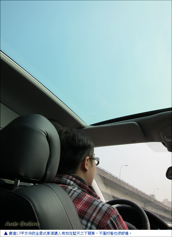 廣達1.7平方米的玻璃車頂豪不吝嗇的給予車內滿滿的陽光,當天氣好時一抬頭就是藍天浮雲相當愜意。不過別也擔心因此頭頂熱到冒煙,因為除了拉簾之外車頂玻璃已經做了染色處理,我們也在難得的冬陽下有著相當舒適的駕駛體驗。