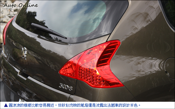 不過跟308相比這台變高的3008在樣貌上其實也與308不盡相同。當初為了打造308的操控與動感的外觀氛圍,於是當時的車頭是仿造F1的前鼻翼一樣突出來的。而眼前所看到的3008車身鈑件上就明顯少了尖銳而多了份圓潤。溫和的外觀造型有點像日系休旅車的樣貌,不過看到肉粽形的後尾燈還是多少透露出PEUGEOT 3008充滿設計味的特殊美感。