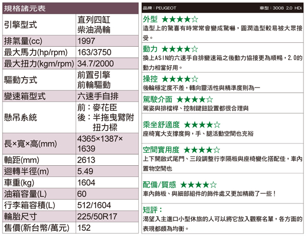 以PEUGEOT 3008 2.0 HDi 4365×1837×1639mm的數據來看,照理它該會與308 SW接近些,為何在文中一直把它跟5008扯在一塊?前面我們已經提到此次試駕的車款最大的改變在於引擎與變速箱的改變,但這顆2.0的柴油引擎和現行308所使用不一樣,而是與5008一樣是L4的DW10C柴油引擎。