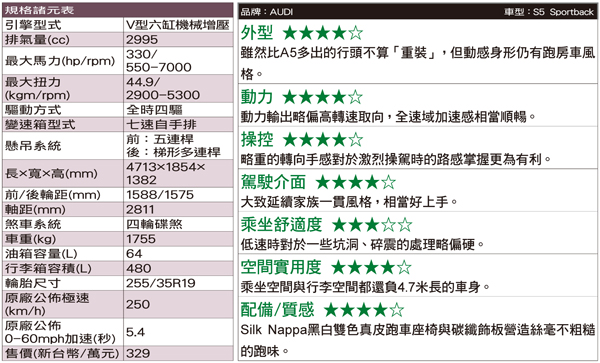 當然「S」的價值還是要看它的性能與操控表現來決定,S5 Sportback跟S4一樣,引擎蓋下面那具動力心臟是近來在AUDI性能房車上頻頻現身的3.0TFSI V6機械增壓引擎,而且連動力輸出設定都一樣,沒有另外調校。0.8bar的增壓值,最大馬力333hp/5500-7000rpm、最大扭力44.9kgm/2900-5300rpm,搭配七速S Tronic雙離合器自手排。雖然不像以前的「S」多半有V8加持,且排氣聲浪更為振奮人心,但這具V6引擎在全球普遍重視環保的氛圍之下不但對環境夠友善,高效率的動力輸出在性能上也仍是強悍,難怪在AUDI性能家族之中屢屢見到它的身影。