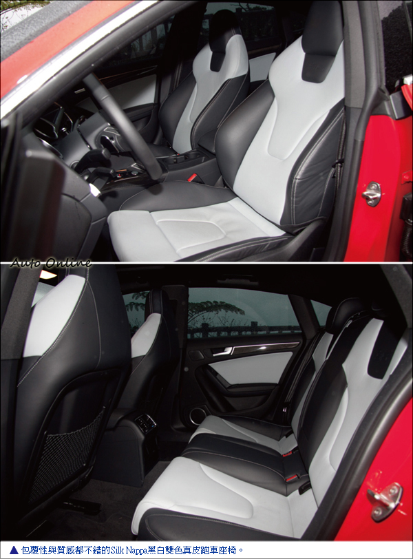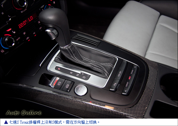 座椅用上了S-Design的專屬Silk Nappa黑白雙色真皮跑車座椅,觸感很佳,且在一般的調整功能之外還提供雙前座電動腰靠與加熱功能(這次冷氣團來襲又跑到山上試車就蠻受用的);木質飾板對S5 Sportback來說自然不會對味,在車門內側與排檔座部分換上專屬的carbon Atlas碳纖維飾板;儀錶板上的白色指針散發出一種冷調的戰鬥氣息,二儀錶中間的彩色DIS駕駛資訊顯示系統在駕駛者發動引擎時秀出S5的logo,給駕駛者一個歡迎上車的招呼。