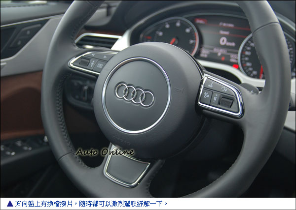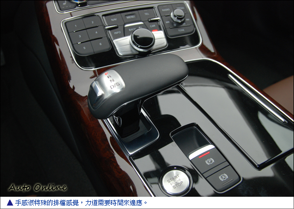 實際在高速公路100km巡航轉速1600rpm,換得的油耗表現可想而知。在D檔巡航時電腦會盡量提早入檔,可以維持最高速度最低轉速避免產生不必要的油耗;但如果把檔位排入S檔模式,變速箱性情馬上大變,變速箱會延後換檔、油門反應變敏感,油門只要多踩一點變速箱會降檔換取更高的加速反應。特殊的排檔設計需要花點時間來適應,因為不像傳統檔位是一格一格設計,AUDI A8排檔桿永遠維持在中間位置,往後大力一點直接可以從P檔排入D檔,輕一點則排入R檔,拿捏好力道可以排入N檔。