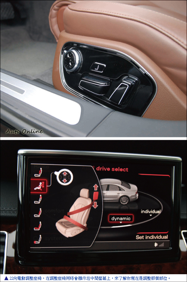 除了quattro系統對操控有幫助外,懸吊也是另一項關鍵,AUDI A8配備Audi Drive Select可程式車身動態系統,可以從車內來調整需要的模式,模式分為三種Comfort、Auto跟Dynamic,其系統整合懸吊、引擎、變速箱跟轉向系統。Comfort模式下車身動態處理屬於最舒適狀態,不管是懸吊設定或者變速箱反應都是最適合承載老闆,方向盤轉動也是最輕鬆。如果把模式切換為Dynamic,懸吊會從舒適轉為硬朗,變速箱換檔反應變靈敏,方向盤會變重手,AUDI A8頓時從豪華房車轉變為雙門跑車。車主也能在AUDI Individual功能下依照駕駛者習慣自訂各項目的參數。