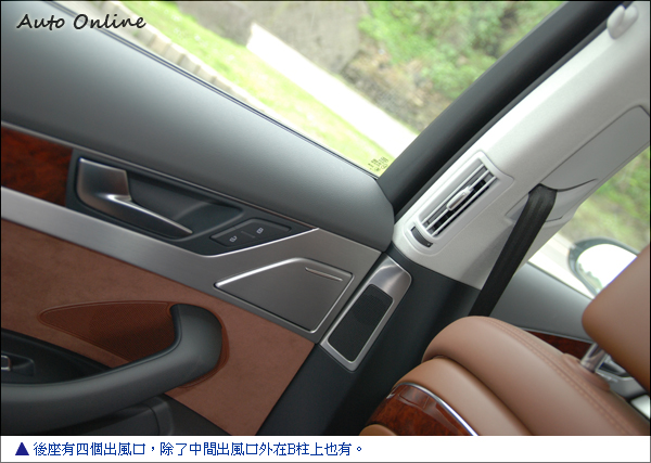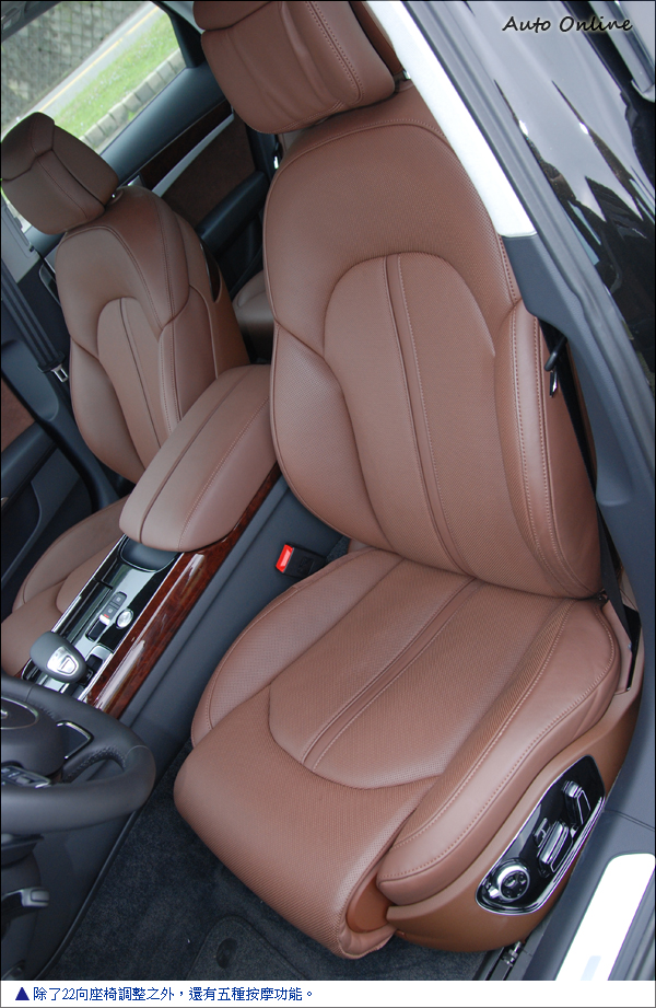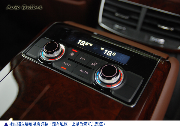 AUDI A8 V6短軸版本或者A8L長軸版本,雙前座都配備22向電動椅調整功能,可以電動調整頭枕高度、安全帶高度,就連椅背傾斜可分兩種區段,座椅包覆性也在調整範圍內。雖然短軸版本比較傾向於自駕車主購買,不過要載老闆後座也不會讓感覺太簡陋,後座中央扶手有雙獨立冷氣溫度控制鍵,加上前座,車內是就是四區獨立空調。影音娛樂設備單片DVD撥放器、20G Jukebox、14組高傳真揚聲器Bose環繞音響,是AUDI A8 V6標準配備。