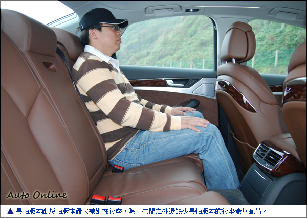 AUDI A8 V6短軸版本在一天的試駕行程下,豪華車等級卻有如此強的操控樂趣,讓人體會到為什麼玩命快遞傑森史塔森會那麼喜歡用AUDI A8作為快遞交通工具。AUDI A8在車內的豪華配備豐富到不會讓人覺得誠意不夠,對手有的配備在A8上也都有,A8上有的配備對手車上並不一定看的到,頂級豪華轎車就該把奢華集於一身。AUDI A8L長軸版本偏向後座買家型,所以後座該有的豪華配備應有盡有,短軸版本雖然在後座沒有長軸版來的奢華,但該有的配備AUDI並不吝嗇提供給消費者。