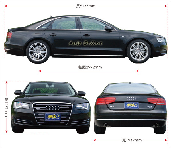 在前幾期本刊雜誌內看到的試駕報導是AUDI A8L長軸版本,比較偏向於後座買家選擇車型,這一次試駕的是AUDI A8 V6短軸版本,長軸版本車長跟軸距分別為5267mm跟3122mm,而短軸版本的A8是5137mm與2992mm,車長跟軸距都比長軸版本短130mm,別看這130mm好像沒有相差多少,實際駕駛感受是會被這短短的130mm所影響。
