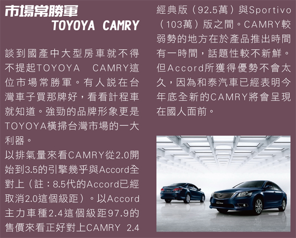 當然就車輛的本值來說Accord是不錯的產品,好開、有運動性內裝也不錯!但想要不等同於需要,所以市面上幾乎國產的中大型房車都賣的很吃力。CAMRY不好嗎?Mondeo不好嗎?Teana不好嗎?我想問題不在本質,而是現在的風向不在這罷了!