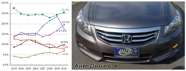 在調查圖表中顯示,景氣復甦對各車型都呈現向上的走勢,唯獨兩款車型例外,一是小型車(如Fit)再者則是我們今天所試駕的中型(中大型)房車。小型車的衰退我可以解釋成股市的盤面整理,因為他是由2009的24%左右調整到2010年的17.6%。但唯獨如Accord這樣中大型房車級距的車型是從2003年開始一路往下走,到現在約莫是7.8%的市占率。