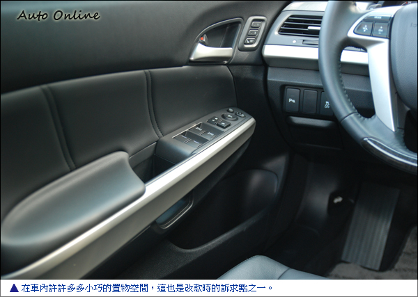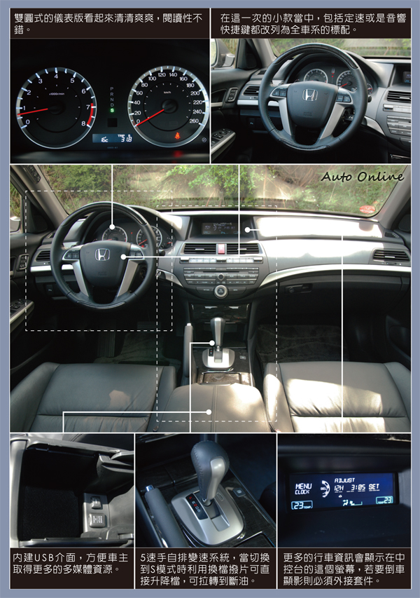雖然外觀上的變動不大,但在許多看不到的地方Accord悄悄進行許多處寧靜革命,將行路感修飾的更寧靜與細緻,車系編成也精簡成2.4與3.5 V6兩款。取消2.0這個級距之後2.4基本款依舊維持97.9萬的售價。為了強化競爭力也將定速巡航、音響快捷鍵、晶片折疊鑰匙以及前霧燈等列為標準配備,祈能吸引消費者的青睞。