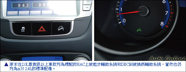 原本在2.0L尊貴級以上車款列為標配的HAC上坡起步輔助系統和DBC斜坡換將輔助系統,當然也仍列為ix35 2.4L的標準配備,當然連同ESP電子車身穩定系統以及ROP電子車身防傾系統,也都列入ix35 2.4L的配備清單中。