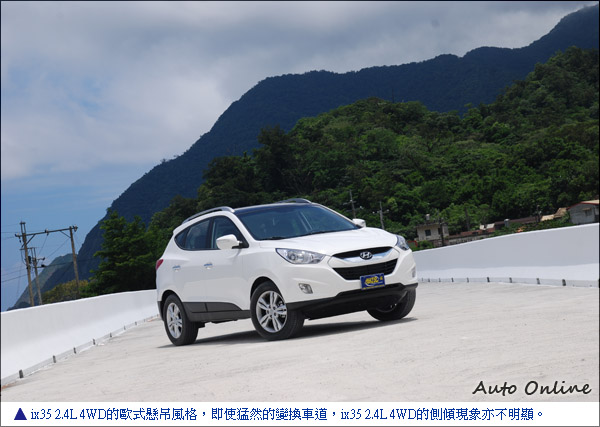 至於高速公路變換車道時的穩定表現,ix35 2.4L 4WD的歐式懸吊風格,則像個乖乖牌般的將ix35牢牢的扣在駕駛所預定行駛的路跡上,即使猛然的變換車道,ix35 2.4L 4WD的側傾現象亦不明顯。