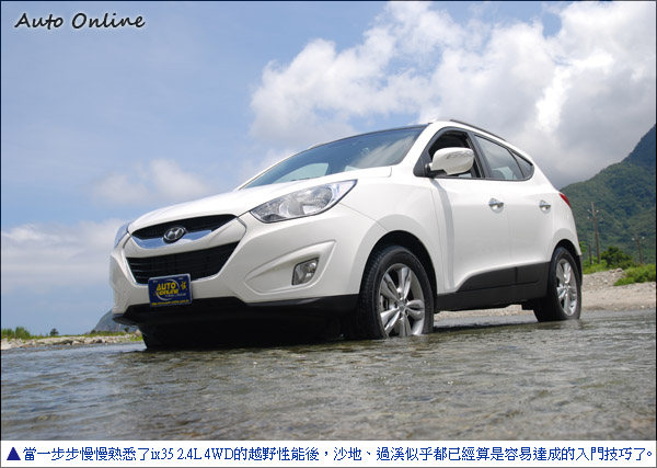 而在越野地形時,起初尚未充份瞭解ix35 2.4L 4WD的能耐前,先採取保守的行跡路線,當一步步慢慢熟悉了ix35 2.4L 4WD的越野性能後,沙地、過溪似乎都已經算是容易達成的入門技巧了。不過行走在河床地形時,還是得要步步為營,畢竟ix35 2.4L 4WD不是專業的SUV車款,底盤耐衝擊的程度當然不及這些專業的SUV。