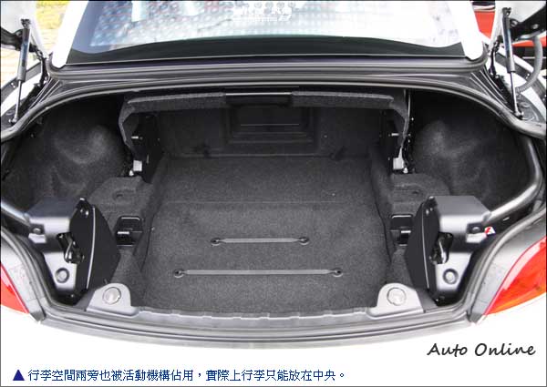 配置![]() ▲車頂收起後,收進後車廂內,全部動作20秒完成。車頂的開與關都可在20秒左右完成,一般無論是三片式或兩片式硬頂,都差不多是這樣的時間,不會相差太多。不過後行李空間始終是敞篷車被犧牲的地方,由於引擎在前方,幸好保留一點可以置放中型背包的空間,但打開廂蓋還是看得到大部分的空間都留給硬頂與連桿機構。