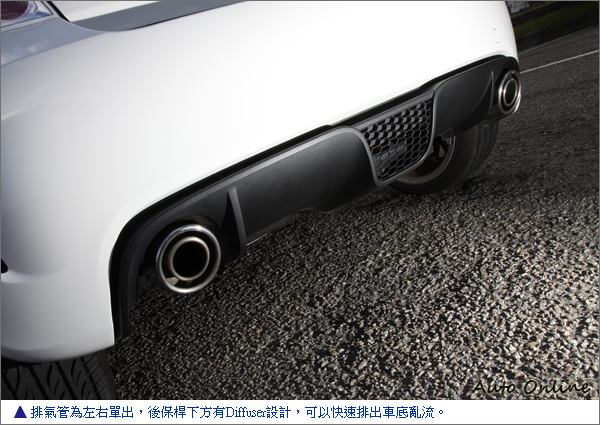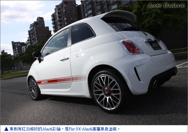 Abarth版本跟一般版本的FIAT 500外觀最大差別,在前、後保桿兩側都有開孔增加散熱,後方保桿下方有Diffuser設計快速排出車底亂流,加上大面積尾翼提高車尾穩定性,但老實說裝了那麼多空氣套件配備,Fiat 500還是脫離不了可愛氛圍。