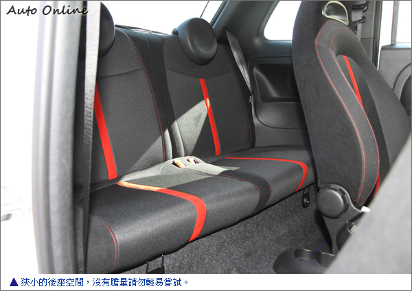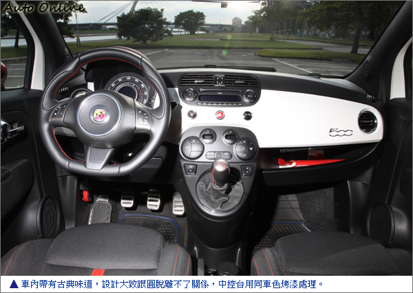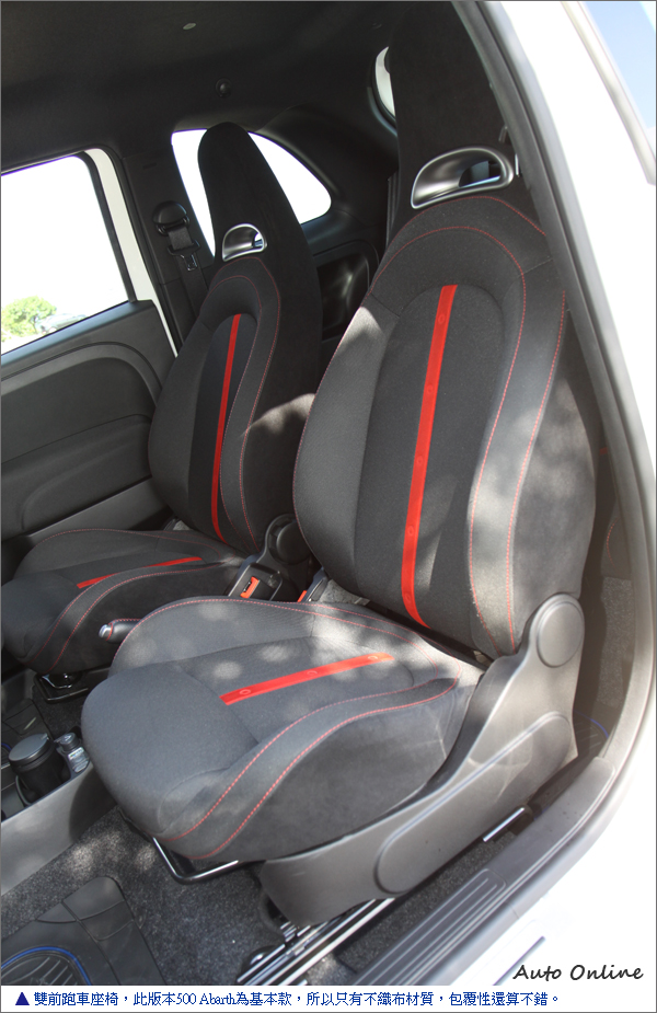 當你坐進FIAT 500的駕駛座其實你不會想要認真的去激烈操駕它,但如果坐進 500 Abarth那可就不一樣。大圓設計的時速錶以及轉速錶,中間有圓形行車旅行電腦,在居中的大圓儀錶左方有顆小儀錶顯示增壓值以及超轉燈。中控台上有圓形音響、冷氣控制按鍵、圓形冷氣出風口,舉目看到的元素都是圓形,跟外觀相互輝映。內裝用料及質感都屬高水準,同車身烤漆的中控台、不織布材質的賽車座椅跟門飾板,但車內空間有點狹小,左右空間不足加上成人無法坐的後座,讓人無法忘記它還是一台軸距只有2300mm的小車。