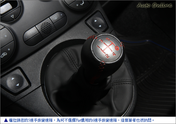 在台北市南港牽到車開往內湖河濱公園的路上,不平的市區道路讓偏向跑格設定的FIAT 500 Abarth乘坐感覺有點顛簸,但這顛簸感覺不會讓人感到不悅,想必Abarth累積了長時間的比賽經驗,在懸吊設定上有自家一套功夫。市區多車的路況下,把1.4升搭配小渦輪的輕快感表現無疑,2000rpm後渦輪開始增壓,輕快的油門在這類的短距離加速非常有優勢,加上5速手排設計檔位的齒比綿密,更突顯出500 Abarth輕巧活潑特性。