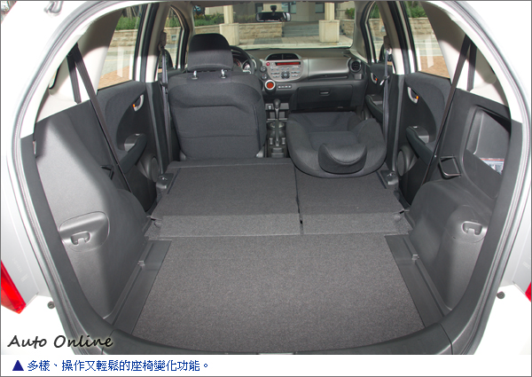 不過,Fit車內最令我們中意的,還是它在空間規劃與座椅設計上的貼心。油箱配置於前座之下,就是為了避免去佔用到後方空間。至於多樣的座椅變化,主要是來自於後座的One-motion拉桿設計。例如拉下拉桿將後座椅背向前打平,就可以與行李廂連結成平坦的大空間,要放進大型物品就很方便,二部小折幾乎不用拆輪胎或零件就可以直接放進去;60:40分離的椅背也可以依照後座載人、載物的實際需求做相對應的調整。