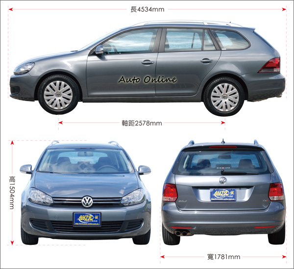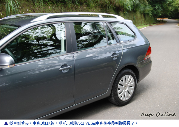 從車頭望去,與一般Golf一模一個様,再從車側看去,車身B柱以前和正常五門Golf也是看不出其之差別的,但自B柱以後,即有不一樣了!車身後半段的行李廂明顯變長了許多。Golf Variant的長、寬、高分別為4534mm、1781mm、1504mm,而軸距仍維持與Golf一樣的2578mm,除了軸距增長了33公分左右外,其它的尺碼則與Golf近乎雷同。
