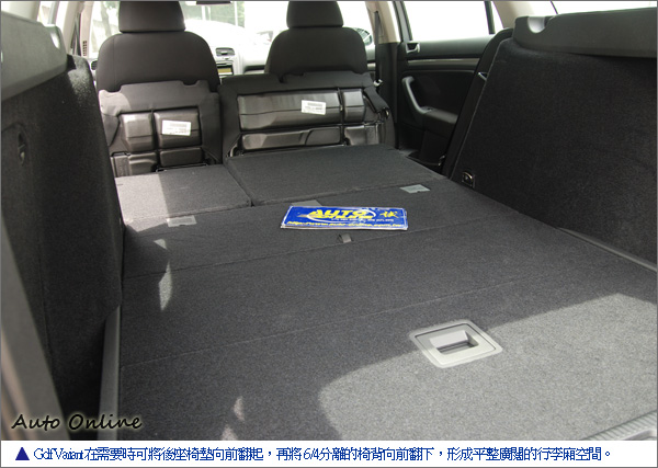 Golf Variant的座椅採全新的分離式折疊後座椅,在需要時可將後座椅墊向前翻起,再將6/4分離的椅背向前翻下,形成平整廣闊的行李廂空間。行李廂底板下,還藏有兩個扁格的置物空間,可收納扁形的小物。