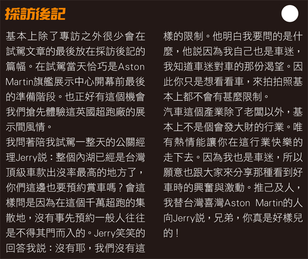 結束一天的試駕之後,走回停車場看到停在角落旁等著我的小國產車,心中的感動有如美夢一樣,總會有醒來的那一刻。我的雙手似乎還可以隱約的感覺到V8 Vantage Roadster由車身底盤所傳回來的那股震動。這車等試駕等了好久,但試過之後真覺得等待的有價值,在自己的試車牆上又完整了一次美好經驗。