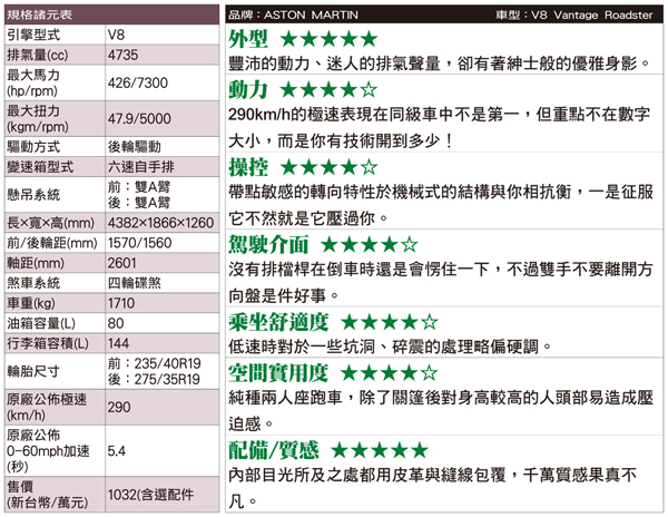 要談數據其實Aston Martin絕對不是拔尖的那一個,但它迷人的地方就在於它的品味與整體的協調。你很難把V8 Vantage Roadster歸類為文臣還是武將,因為似乎這兩者它都有著水準之上的表現。